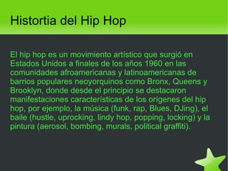 El hip hop es un movimiento artístico que emergió en Estados Unidos a finales de los años 1960, originándose en comunidades afroamericanas y latinoamericanas de Nueva York, donde música, baile y pintura se entrelazaron. Las fiestas callejeras promovieron el desarrollo de técnicas como el rapping, mientras que artistas como Zatu y Porta han marcado la escena del hip hop en España. Este documento también destaca a raperos contemporáneos y su evolución dentro del género.