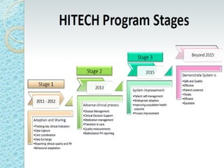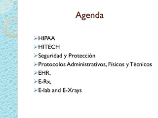 Este documento proporciona una introducción a HIPAA, HITECH y los protocolos y regulaciones relacionados con la privacidad y seguridad de la información de salud protegida. Explica brevemente los objetivos de HIPAA y HITECH, así como los requisitos de privacidad, seguridad física y técnica, y los beneficios del uso de registros médicos electrónicos, recetas electrónicas y resultados de laboratorio y radiología electrónicos.