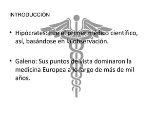 Este documento describe a Hipócrates y Galeno, dos figuras fundamentales en la historia de la medicina. Hipócrates fue el primer médico científico en la antigua Grecia y rechazó las creencias sobrenaturales sobre las enfermedades. Galeno dominó la medicina europea durante más de mil años basándose en los principios de Hipócrates y realizando disecciones de animales. Ambos hicieron contribuciones importantes al desarrollo del método científico en medicina.