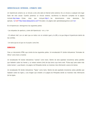 Los hipervínculos permiten enlazar partes de un documento o sitio web, o enlazar a otros documentos o sitios externos. Se utiliza la etiqueta <a> para crear enlaces, y los atributos "name" y "href" para asignar un nombre o dirección de destino. Al hacer clic en un enlace, se carga la página o sección vinculada.