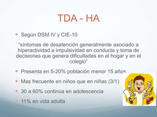Este documento proporciona información sobre el trastorno por déficit de atención con hiperactividad (TDAH). Explica los síntomas clínicos, la etiología, el diagnóstico y el tratamiento del TDAH según el DSM-IV y la CIE-10. También discute si este trastorno está sobrediagnosticado y presenta perspectivas alternativas sobre el modelo psiquiátrico de diagnóstico.
