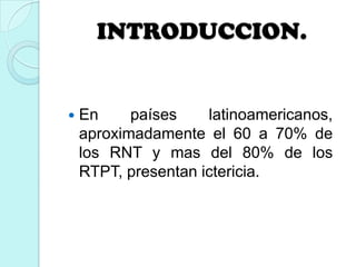 El documento detalla un plan de cuidados para neonatos con hiperbilirrubinemia, destacando la prevalencia y las causas de la ictericia en recién nacidos. Se presentan estrategias diagnósticas y de tratamiento, incluyendo fototerapia y exanguineotransfusión, así como diagnósticos de enfermería orientados a la ansiedad, alimentación y regulación de temperatura. El objetivo es optimizar la atención y manejo de estos pacientes para mejorar su salud y bienestar.