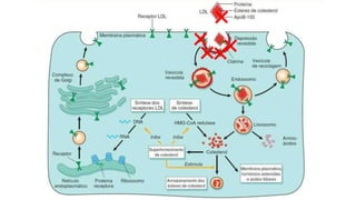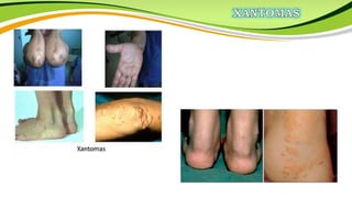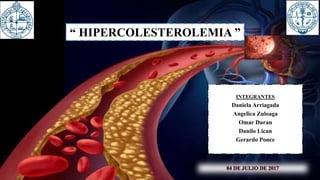 La hipercolesterolemia es una condición clínica caracterizada por niveles anormalmente altos de colesterol en la sangre, incluyendo colesterol total, colesterol LDL y triglicéridos, que representan un riesgo para la salud. El colesterol cumple funciones estructurales y es el precursor de hormonas, pero niveles altos pueden deberse a dietas inadecuadas, enfermedades hepáticas, endocrinas o renales, o defectos genéticos. La hipercolesterolemia se asocia con