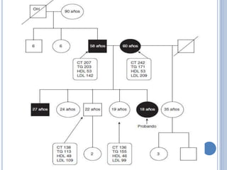 1) La hipercolesterolemia familiar es una enfermedad genética dominante causada por mutaciones en el gen del receptor de LDL que causa niveles elevados de colesterol LDL.