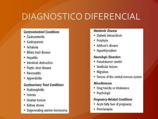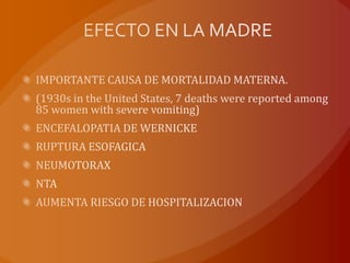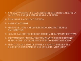La hiperemesis gravidica es una condición común que causa náuseas y vómitos severos en mujeres embarazadas. Afecta la calidad de vida y puede causar complicaciones de salud si no se trata, incluida la hospitalización. Se cree que está relacionada con cambios hormonales durante el embarazo como los niveles elevados de gonadotropina coriónica humana y estrógenos. El tratamiento incluye modificaciones del estilo de vida, suplementos nutricionales y medicamentos antináuseas y antiem