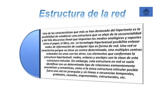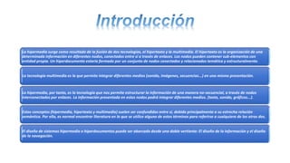 La hipermedia surge de la fusión del hipertexto y la multimedia. El hipertexto organiza la información en nodos interconectados por enlaces, mientras que la multimedia permite integrar diferentes medios como texto, imágenes y sonido. La hipermedia estructura la información de manera no secuencial a través de nodos interconectados que pueden contener diferentes tipos de medios.