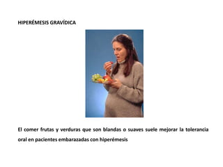 El documento habla sobre la hiperémesis gravídica, una afección que causa náuseas y vómitos severos en mujeres embarazadas. Se cree que es causada por cambios hormonales durante el embarazo como altos niveles de HCG. Puede causar deshidratación, pérdida de peso y problemas nutricionales para la madre y el feto. El tratamiento incluye control de electrolitos, hidratación intravenosa, antieméticos como ondansetrón, y en casos graves, reposo en cama y