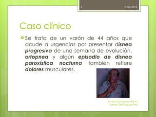 Este documento describe el caso de un paciente de 44 años con insuficiencia renal e hiperpotasemia que acudió a urgencias con disnea. Presentaba una potasemia de 8,4 mEq/l. Se le administró gluconato cálcico, insulina con glucosa, salbutamol y bicarbonato sódico para trasferir el potasio a las células e incrementar su excreción renal, además de oxígeno y diuréticos para aliviar los síntomas y estabilizarlo.