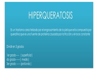 La hiperqueratosis es un engrosamiento de la capa externa de la piel compuesta de queratina. Puede causar callos en las manos y plantas de los pies. Las verrugas son crecimientos cutáneos causados por el virus del papiloma humano que pueden aparecer en cualquier parte de la piel. Los helomas son alteraciones comunes en el pie que causan dolor y dificultan caminar.
