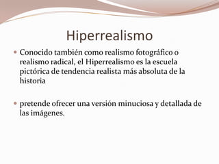 El hiperrealismo surgió a finales de los años 1960 en la costa oeste de Estados Unidos, promoviéndose en Europa en la década de 1970. Se caracteriza por buscar una transcripción extremadamente detallada de la realidad a través de técnicas fotográficas en la pintura y escultura, logrando el mismo nivel de detalle que una fotografía. Algunos de los principales artistas hiperrealistas fueron Duane Hanson y John de Andrea en escultura.