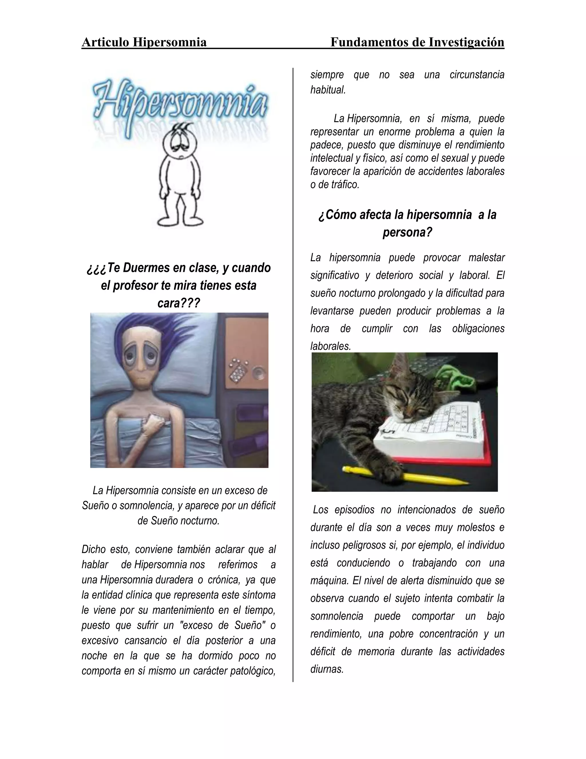 La hipersomnia consiste en un exceso de sueño o somnolencia diurna causado por un déficit de sueño nocturno. Afecta más a personas entre 15-30 años y puede causar problemas en el rendimiento laboral y las relaciones sociales. Se trata con terapias no farmacológicas como cambios en la higiene del sueño y también con medicamentos.