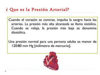 La hipertensión arterial es una enfermedad caracterizada por el aumento del grosor de la pared arterial y resistencia en las arterias. Sus causas pueden ser primarias o secundarias, con síntomas como vértigos y dolor de cabeza. Se aconseja a los pacientes leer etiquetas de alimentos para un mejor control, evitando aditivos desaconsejados.
