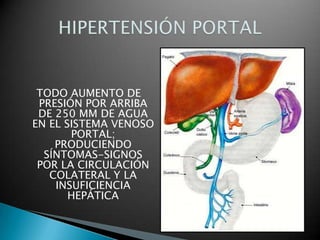 Este documento describe la hipertensión portal, que ocurre cuando la presión en el sistema venoso portal supera los 250 mm de agua. Explica las causas prehepáticas, hepáticas y poshepáticas de la hipertensión portal y describe la anatomía patológica de la circulación hepatopetal y hepatofugal. También resume las manifestaciones clínicas como ascitis, hemorragia y encefalopatía hepática, y discute el tratamiento quirúrgico y no quirúrgico de las varices esofágicas y la ascitis.