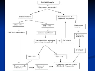 El documento presenta nuevas guías para la prevención, diagnóstico, evaluación y tratamiento de la hipertensión arterial. Resalta la importancia de medir la presión sistólica en mayores de 50 años y clasifica a los pacientes con presión entre 120-139/80-89 mmHg como prehipertensos. Recomienda el uso de diuréticos tiazídicos solos o combinados con otro fármaco, incluyendo bloqueadores de angiotensina. Para la mayoría de pacientes se requerirán dos o más fármacos, usualmente