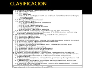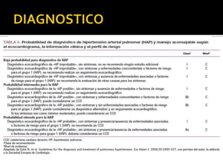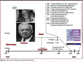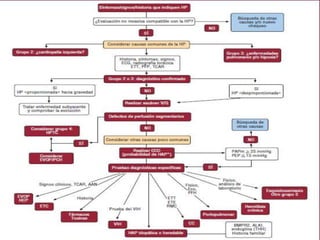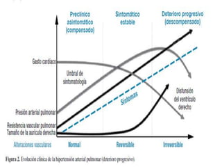 Este documento discute la hipertensión pulmonar, incluyendo su fisiopatología, diagnóstico, clasificación y manejo. En particular, describe los mecanismos por los cuales el óxido nítrico y la prostaciclina causan vasodilatación pulmonar, así como factores que causan vasoconstricción. También cubre temas como la evaluación del paciente, pruebas diagnósticas, clasificación funcional de la enfermedad, y opciones de tratamiento médico y quirúrgico.