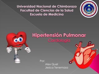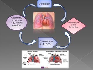 Este documento define la hipertensión arterial pulmonar (HTAP), describe su prevalencia, factores de riesgo, clasificación, anatomía patológica, fisiopatología, manifestaciones clínicas, diagnóstico y tratamiento. La HTAP se caracteriza por una presión arterial pulmonar en reposo mayor a 25 mmHg y durante el ejercicio mayor a 30 mmHg. Es más común en mujeres de 30 a 40 años. Los factores de riesgo incluyen enfermedades hepáticas, VIH, drogas como la cocaína y anfetamin