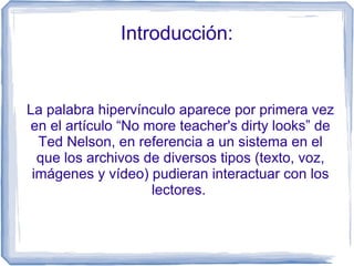 El documento describe el hipertexto, que fue introducido por primera vez por Ted Nelson en los años 60. El hipertexto permite la lectura no lineal a través de hipervínculos que conectan diferentes nodos de información. Los tipos de hipertexto incluyen hipervínculos y stretchtext. Los elementos clave del hipertexto son los nodos que contienen la información, los enlaces que conectan los nodos y los anclajes que activan los enlaces. El hipertexto optimiza el acceso a la información y transforma la producción y organización de los text