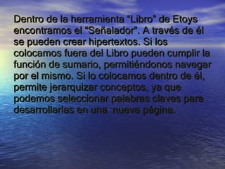 Este documento proporciona instrucciones para crear hipertextos en Etoys. Explica que los señaladores permiten crear enlaces hipertextuales y pueden usarse para jerarquizar conceptos dentro de un libro o como sumario colocándolos fuera del libro. Da los pasos para agregar páginas y señaladores a un libro, cambiar la etiqueta de los señaladores y duplicarlos para crear enlaces internos o externos.