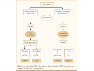 El documento habla sobre el hipertiroidismo en atención primaria. Explica las causas del hipertiroidismo, como la enfermedad de Graves-Basedow y el bocio multinodular tóxico. También describe los síntomas como intolerancia al calor y palpitaciones. Luego detalla las pruebas de diagnóstico como análisis de sangre y ecografía tiroidea. Finalmente, cubre las opciones de tratamiento como los antitiroideos, cirugía y yodo radiactivo, así como las derivaciones a endocrinología u