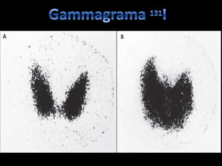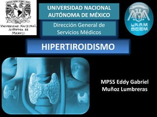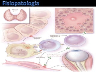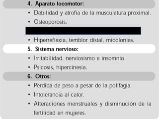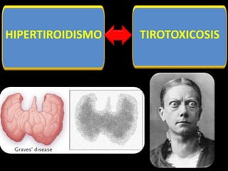 Este documento trata sobre la hipertiroidismo y tirotoxicosis. Describe las causas primarias y secundarias de hipertiroidismo como la enfermedad de Graves, bocio multinodular tóxico y adenoma tóxico. También cubre la tirotoxicosis sin hipertiroidismo como la tiroiditis subaguda y la ingestión excesiva de hormona tiroidea. Explica los síntomas, factores de riesgo y tratamientos para estas condiciones, incluidos los medicamentos, yodo radiactivo y cirugía.