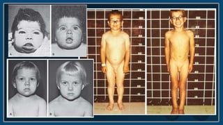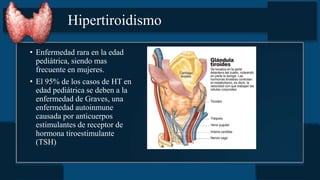 Este documento trata sobre el hipertiroidismo y el hipotiroidismo. Explica que el hipertiroidismo es más común en mujeres y que el 95% de los casos en niños se debe a la enfermedad de Graves, una enfermedad autoinmune. También describe las causas, signos y síntomas, diagnóstico y tratamiento del hipertiroidismo neonatal y la crisis tirotóxica. Finalmente, cubre las causas del hipotiroidismo congénito y adquirido y su diagnóstico y tratamiento.