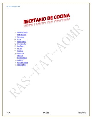 El documento presenta una lista de 15 platillos típicos mexicanos y sus recetas, incluyendo pastel de carne, pay de queso, barbacoa, pizza, pavo relleno, crema de elote, estofado, lasaña, entre otros. Cada receta detalla los ingredientes necesarios y los pasos a seguir para preparar el platillo.