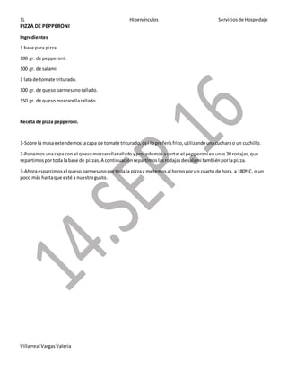 El documento proporciona recetas de 10 platillos típicos mexicanos: pizza de peperoni, lasaña, spaguetti a la boloñesa, brochetas de cordero, mole, burritos de chili, pan de elote, tacos al pastor y wraps de lechuga. Cada receta incluye una lista de ingredientes y pasos detallados para su preparación.