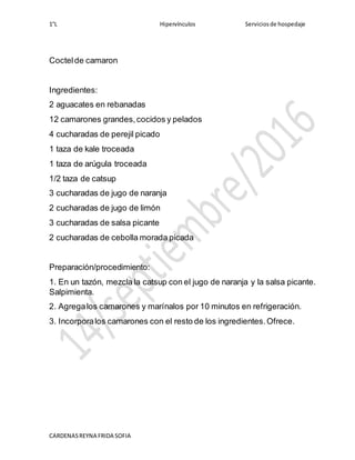 Este documento proporciona una lista de 10 platillos mexicanos populares y una receta detallada para preparar un coctel de camarones. La receta incluye ingredientes como camarones, aguacate, kale, arúgula, catsup, jugos de naranja y limón, salsa picante y cebolla morada. Las instrucciones explican cómo marinar los camarones en una mezcla de catsup, jugo de naranja y salsa picante antes de agregarlos al resto de los ingredientes para servir.