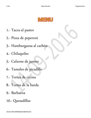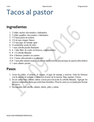 El documento proporciona una receta para tacos al pastor que incluye una lista de ingredientes y pasos. La lista de ingredientes incluye carne de cerdo, chiles, achiote, vinagre, jugo de naranja agria y cebolla. Los pasos describen marinar la carne con una mezcla de chiles y achiote, saltear la carne y cebolla, y picar la carne cocida para formar los tacos. Se acompañan los tacos con cebolla, cilantro, limón, piña y salsa.