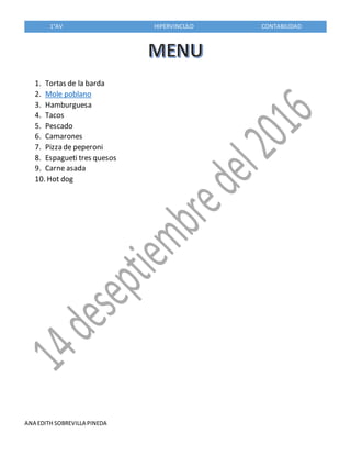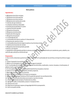 El documento proporciona una receta para mole poblano, un plato típico mexicano. La receta incluye una lista de ingredientes como chiles mulatos, pasillas, anchos, manteca de cerdo, ajos, cebollas, pasas, almendras, pepitas de chile y especias. La preparación implica asar y remojar los chiles, tostar ajonjolí y semillas, freír varios ingredientes, y cocinar la mezcla con caldo de pollo, tomate, chocolate y especias hasta espesar. Se sirve