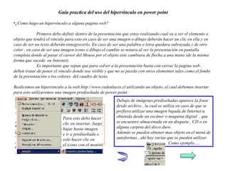 Un hipervínculo permite vincular un objeto o texto a otra diapositiva, archivo o página web para facilitar el acceso a la información. Para crear un hipervínculo se selecciona el objeto o texto, se inserta un hipervínculo y se ingresa la ubicación a la que se desea vincular. Para modificar un hipervínculo existente se selecciona el objeto vinculado, se abre el menú contextual y se elige la opción para modificar el enlace.