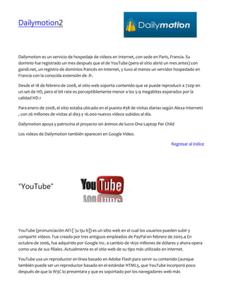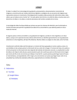 El documento habla sobre diferentes servicios de alojamiento de videos en línea como YouTube, Dailymotion, Google Videos y Dalealplay. Describe brevemente el origen, características y funcionalidades de cada plataforma.