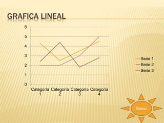 El documento presenta diferentes tipos de gráficos como gráficos lineales, circulares, de columna y de barras para mostrar datos numéricos y porcentajes de diferentes categorías y series a lo largo del tiempo.