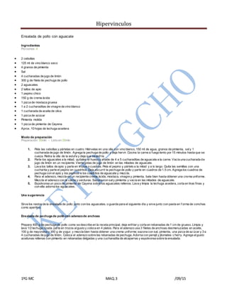 Este documento contiene una lista de 15 recetas de comida y las instrucciones detalladas para preparar 3 de ellas: ensalada de pollo, spaguetti a la boloñesa y crema de champiñones. Incluye los ingredientes necesarios y los pasos a seguir para cada receta.