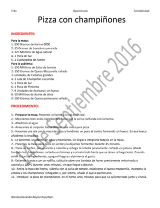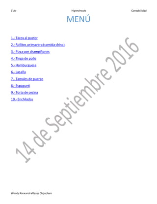 El documento presenta recetas de 10 platillos mexicanos populares. Incluye ingredientes y pasos para preparar tacos al pastor, rollitos primavera, pizza con champiñones, tinga de pollo, hamburguesa, lasaña, tamales de puerco, espagueti, torta de cecina y enchiladas. Proporciona detalles completos para cada receta, incluyendo ingredientes y procedimientos claros para su preparación.