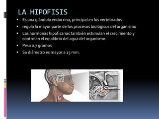 La hipófisis es una glándula endocrina localizada cerca del hipotálamo que regula procesos biológicos y controla el equilibrio de agua a través de hormonas. Está dividida en lóbulos anterior, posterior e intermedio, siendo el anterior el mayor y de color rojizo y el posterior de color gris amarillento. El lóbulo anterior segrega hormonas como la del crecimiento, gonadotrópicas, ACTH y TTH, las cuales estimulan funciones como el crecimiento, la maduración de