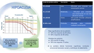 El documento describe la hipoacusia en adultos mayores, incluyendo grados de pérdida auditiva, factores de riesgo y pruebas de diagnóstico. La presbiacusia es la causa más común de sordera en adultos mayores, que generalmente es bilateral y simétrica, dificultando la comprensión en ambientes ruidosos. Otras causas incluyen el tapón de cerumen y la otitis media. La evaluación incluye pruebas como la audiometría, Rinne y Weber. El tratamiento se enfoca en la