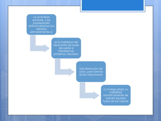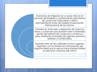 El hipoclorito de sodio se utiliza comúnmente como irrigante durante el tratamiento de conductos radiculares debido a sus propiedades antibacterianas, su capacidad para disolver tejidos y su baja tensión superficial. La gutapercha, un polímero natural producido por árboles, se usa comúnmente para obturar conductos radiculares debido a su facilidad de compactación y adaptación a las irregularidades del conducto. Tanto el hipoclorito de sodio como la gutapercha tienen ventajas y desventajas para su uso en end