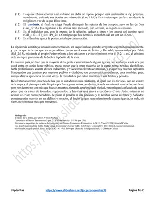 El documento analiza la hipocresía desde una perspectiva bíblica, especialmente a través de la enseñanza de Jesús en los evangelios, destacando que la hipocresía implica engañar a otros sobre la verdadera naturaleza del individuo. Describe a los fariseos como un ejemplo destacado de hipocresía, quienes realizan actos de piedad por el reconocimiento humano en lugar de por fe genuina. Se concluye que muchos que se consideran cristianos pueden caer en esta hipocresía, manteniendo apariencias mientras permanecen espiritualmente muertos.