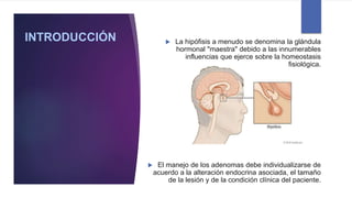 El documento trata sobre la anatomía, clasificación, presentación clínica y tipos de tumores de la hipófisis. Describe la ubicación y componentes de la glándula pituitaria, así como la clasificación de los adenomas hipofisarios según su tamaño y tipo celular. Explica los síntomas y manifestaciones clínicas de los tumores secretores de prolactina, GH, ACTH, TSH, así como el diabetes insípido y el síndrome de secreción inapropiada de ADH.
