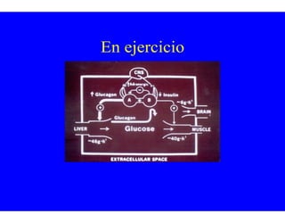 El documento describe la fisiopatología de la hipoglucemia, incluyendo sus niveles de gravedad, mecanismos de contraregulación normal y alterados en diabetes, y factores que contribuyen a la hipoglucemia inadvertida. Explica que la glucosa en sangre menor a 50 mg/dl causa disminución de la función cognitiva, y que diferentes hormonas como el glucagón, epinefrina y cortisol actúan para contrarrestar niveles bajos de glucosa a través de mecanismos como la producción hepática de