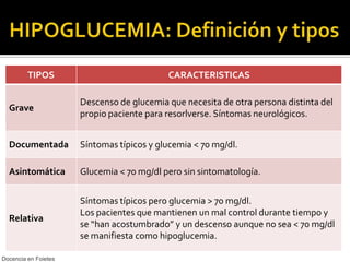 El documento aborda el concepto, prevención, causas y clasificación de la hipoglucemia, así como su detección y tratamiento. Se señala la importancia de una alimentación equilibrada, el ejercicio físico y el seguimiento de tratamientos adecuados para prevenir y actuar ante episodios hipoglucémicos. También se describen las pautas de tratamiento en pacientes conscientes e inconscientes, incluyendo el uso de glucagón y sus precauciones.