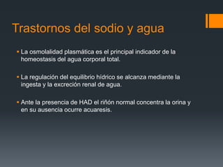 Este documento resume los principales conceptos relacionados con la hiponatremia. Explica que la hiponatremia ocurre cuando hay un exceso de agua en relación al sodio, lo que puede deberse a una depleción absoluta de sodio o a una pérdida de equilibrio hídrico. Describe las manifestaciones agudas y crónicas, los métodos de diagnóstico, y clasifica la hiponatremia en hipotónica e hiperosmolar. Finalmente, detalla las principales causas de hiponatremia hipotónica
