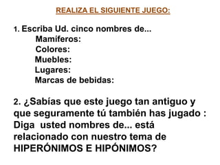 Este documento explica los conceptos de hiperonimia e hiponimia. Un hiperónimo es una palabra de significado más amplio que incluye el significado de otras palabras más específicas llamadas hipónimos. Se dan ejemplos como "flor" es un hiperónimo de clavel, rosa, jazmín. También incluye ejercicios para identificar hiperónimos y hipónimos en diferentes conjuntos de palabras y oraciones, y sustituir términos repetidos por sus hiperónimos correspondientes.