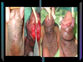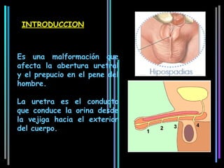 Este documento describe la hipospadia y epispadia, que son malformaciones congénitas que afectan la abertura de la uretra en los niños. La hipospadia ocurre cuando la abertura de la uretra no se encuentra en la punta del pene, mientras que la epispadia ocurre cuando la abertura se encuentra en la parte superior del pene. El documento explica las causas, síntomas, diagnóstico, tratamiento y complicaciones potenciales de estas afecciones, así como los cuidados de enfermería requeridos para los pacientes