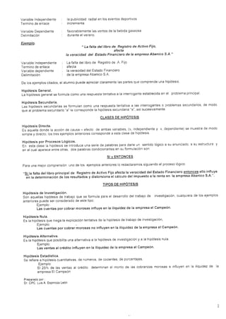 El documento describe los diferentes tipos de hipótesis, incluyendo hipótesis de investigación, nula, alternativa y estadística. Explica que una hipótesis de investigación formula una explicación tentativa a un problema, mientras que una hipótesis nula niega esta explicación y una hipótesis alternativa ofrece otra posible explicación.
