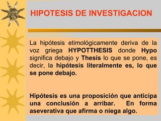 El documento habla sobre las hipótesis en investigación en salud. Explica que una hipótesis es una proposición tentativa sobre posibles relaciones entre variables. Describe los tipos de hipótesis como las nulas, de investigación, alternativas y estadísticas. También explica las características de una hipótesis bien formulada y los criterios para evaluarlas.
