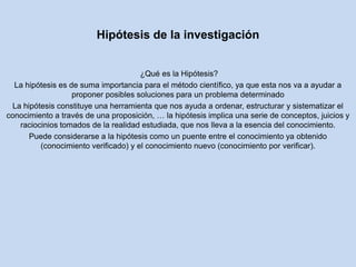 La hipótesis es fundamental para el método científico ya que ayuda a proponer soluciones tentativas a problemas. Una hipótesis debe ser clara, comprobable, específica, y generalizable. Las hipótesis se componen de variables observables y relaciones entre ellas. Existen hipótesis nulas, conceptuales, de trabajo y alternativas que cumplen funciones diferentes en el proceso de investigación.