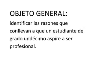 Este documento describe un proyecto de investigación que busca identificar las razones por las cuales los estudiantes del grado 11 de la I.E Sol de Oriente aspiran a ser profesionales. El objetivo general es identificar estas razones, mientras que los objetivos específicos son indagar las aspiraciones de los estudiantes a través de encuestas y conocimiento empírico. La justificación es conocer la cantidad de estudiantes que aspiran a ser profesionales.