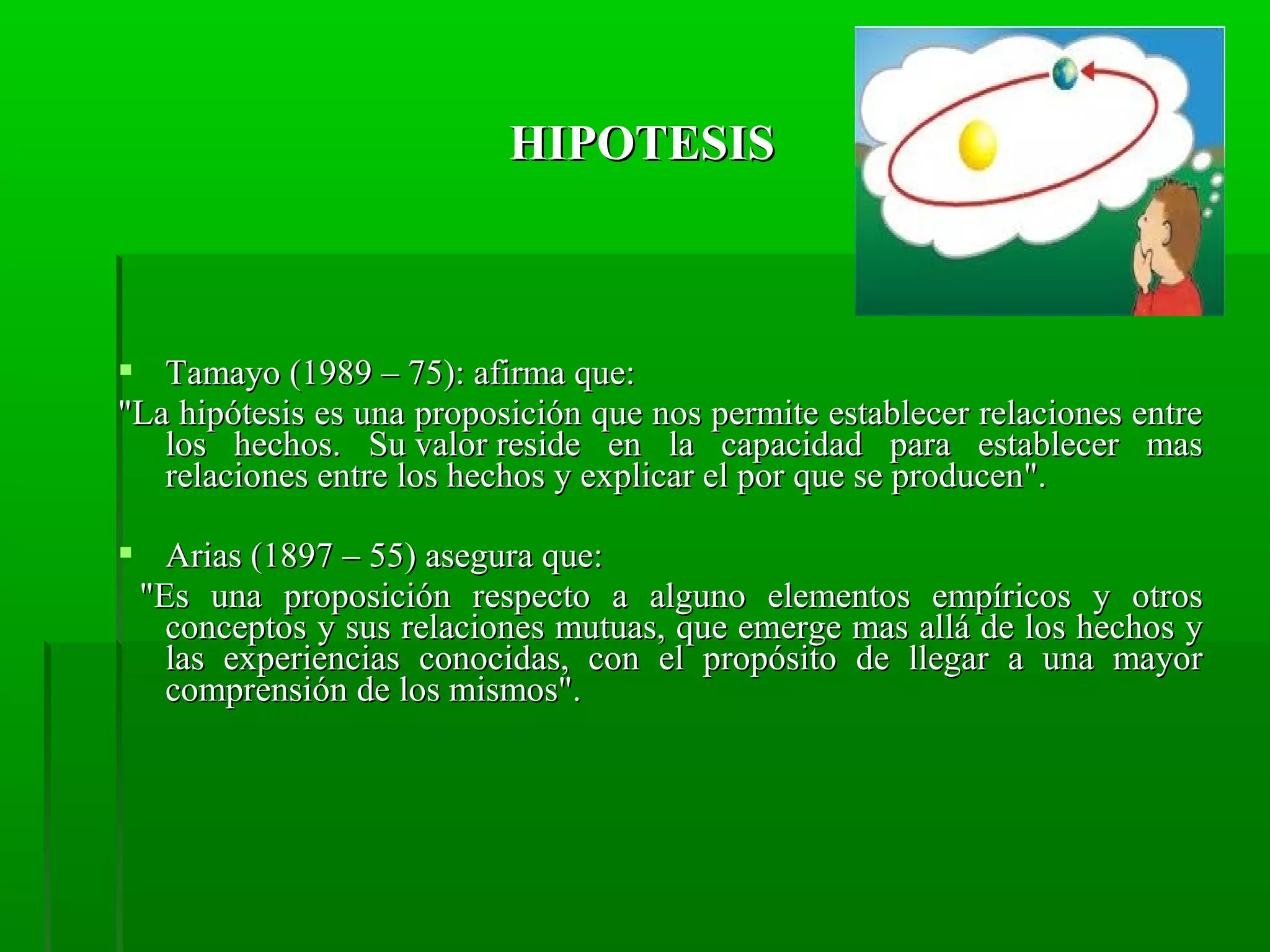 Este documento discute conceptos clave relacionados con la hipótesis en investigación como su definición, características, clasificación y operacionalización. Explica que la hipótesis es una proposición tentativa sobre la relación entre variables que puede ser probada. Describe los tipos de hipótesis como descriptivas, correlacionales y de causalidad y las características que deben cumplir como ser claras, medibles y comprobables. También cubre la clasificación y operacionalización de variables así como los pasos para formular una hipótesis de